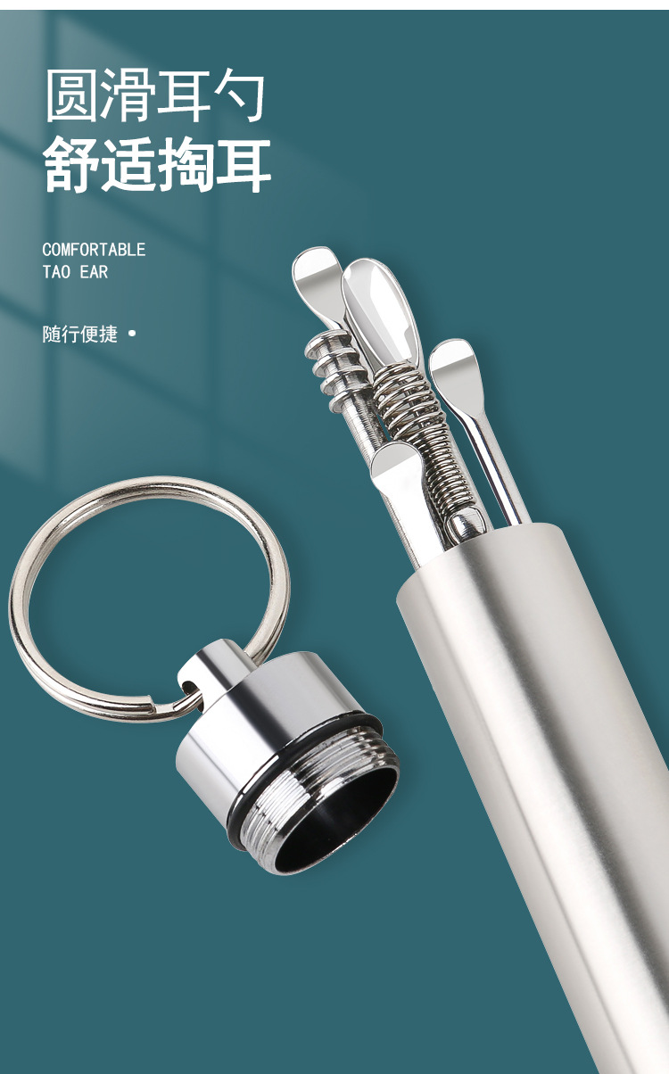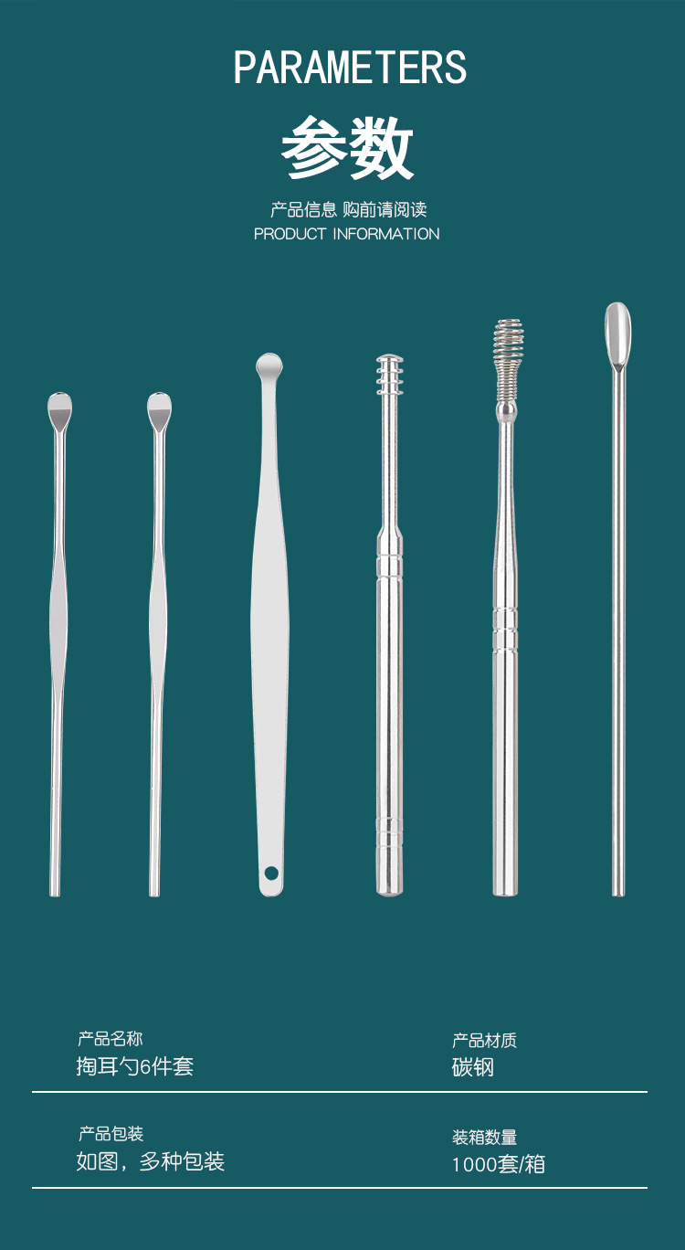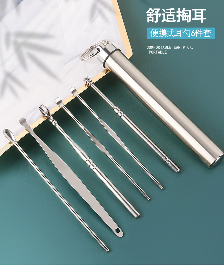 【Instalación de tubos de acero】Cuchara de oreja de acero inoxidable6Juego de herramientas portátiles para recoger orejas con suciedad en espiral y doble cabeza